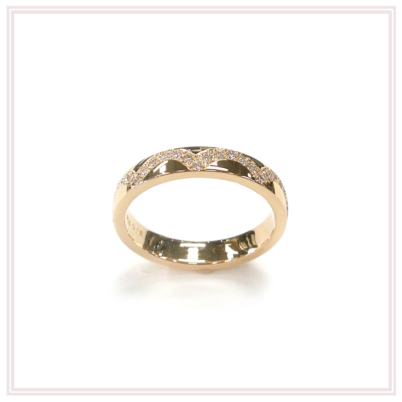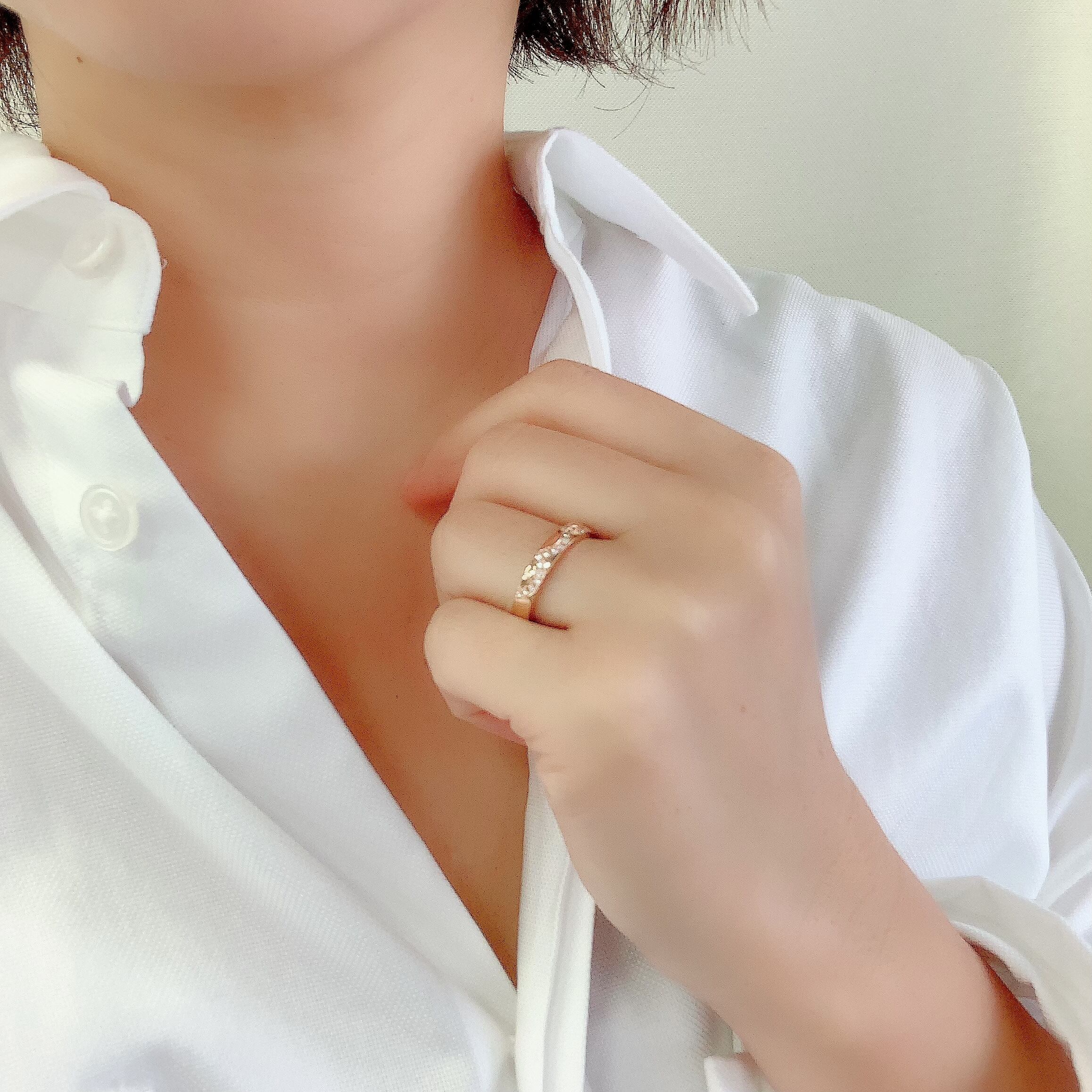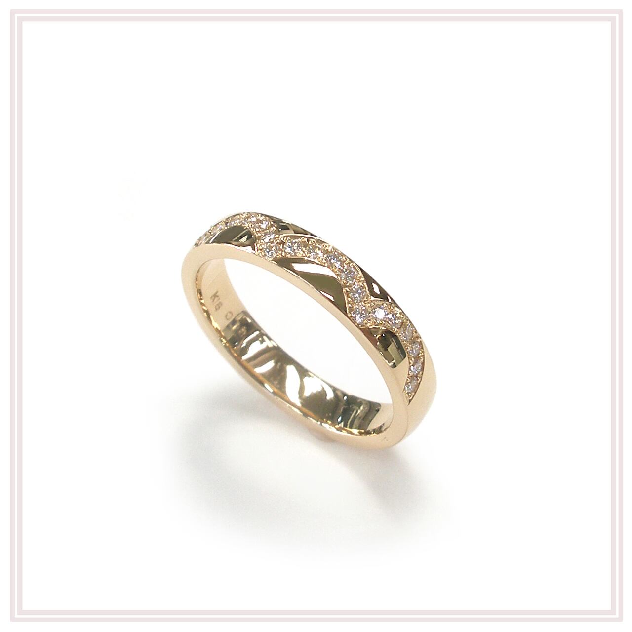 K18ピンクゴールドの平甲丸リングにメレーダイヤモンドを配列した、デザイナー渾身のハンドメイドリングです。リング幅は約3.47mm、ピンクゴールドの優しい色合いと品質の高いメレーダイヤモンドの繊細な輝きで上質なリングに仕上がりました。